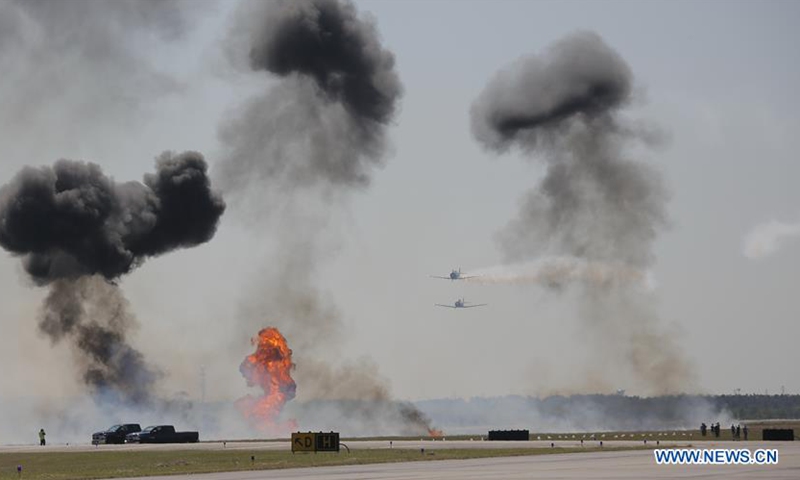 Vintage aircrafts perform at the air show in Houston, the United States, on Oct. 10, 2020. The annual Wings Over Houston Airshow kicked off at the Ellington Airport on Saturday with thrilling aerial performances and displays. Visitors were asked to drive their cars to the show field and stay close to the cars during the show amid the COVID-19 pandemic. (Photo by Lao Chengyue/Xinhua)