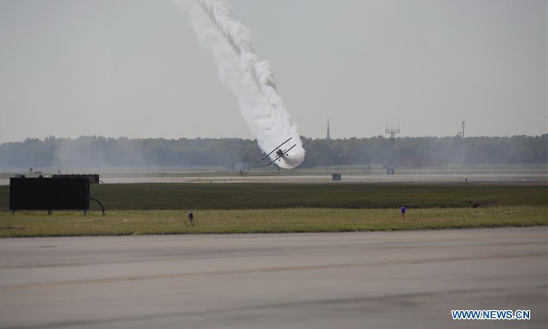 A vintage aircraft performs at the air show in Houston, the United States, on Oct. 10, 2020. The annual Wings Over Houston Airshow kicked off at the Ellington Airport on Saturday with thrilling aerial performances and displays. Visitors were asked to drive their cars to the show field and stay close to the cars during the show amid the COVID-19 pandemic. (Photo by Lao Chengyue/Xinhua)