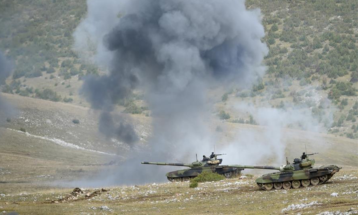 Serbian armored vehicles perform a task during a military exercise at the Pester plateau in southwestern Serbia on Oct. 10, 2020. The Serbian army held a large live-fire tactical exercise on Saturday with a focus on close air support. The exercise demonstrated a joint action of about 2,800 members of the Air Force, the Army, the 72nd Special Operations Brigade, and the 63rd Parachute Brigade, more than 150 combat and non-combat vehicles and combat systems, as well as about 40 aircraft. (Photo by Predrag Milosavljevic/Xinhua)