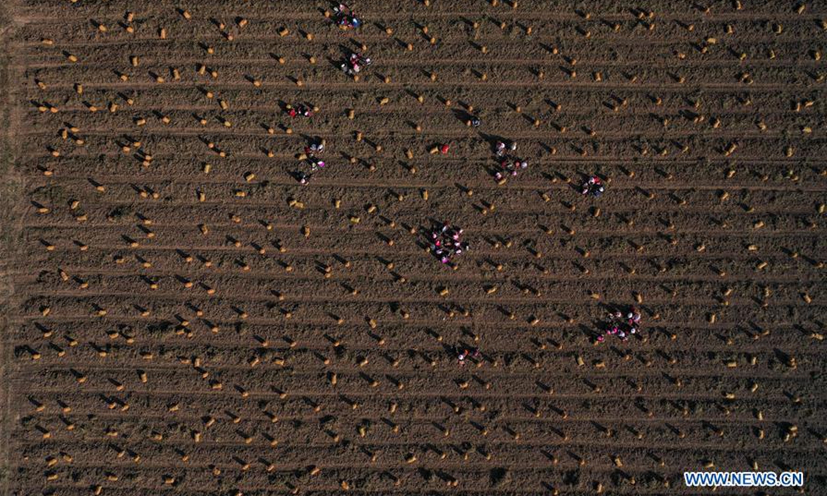 Aerial photo shows villagers sacking potatoes in Zhuozhatan Village of Huzhu Tu Autonomous County, northwest China's Qinghai Province, Oct. 10, 2020. In recent years, the county has been developing the potato industry to help its farmers improve income. (Xinhua/Wu Gang)