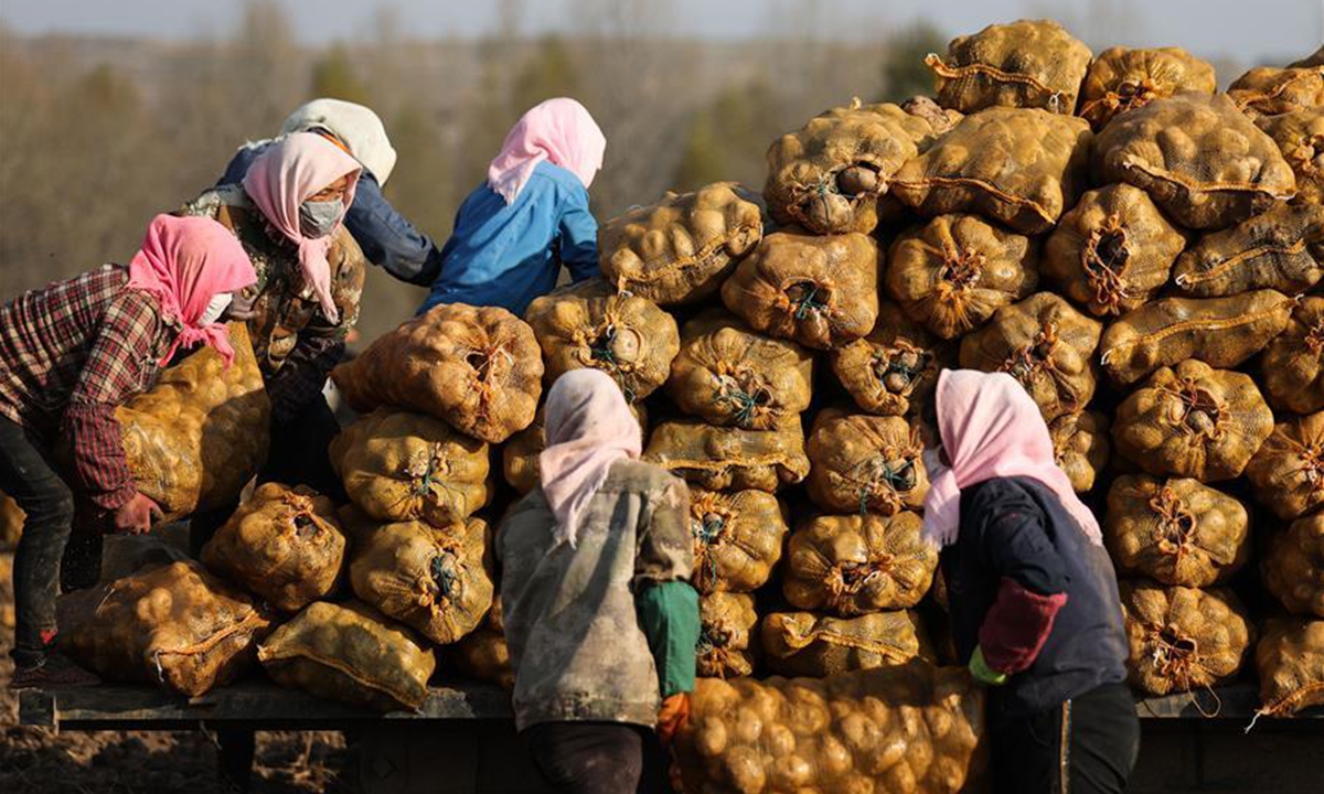 Villagers load sacked potatoes in Zhuozhatan Village of Huzhu Tu Autonomous County, northwest China's Qinghai Province, Oct. 10, 2020. In recent years, the county has been developing the potato industry to help its farmers improve income. (Xinhua/Wu Gang)