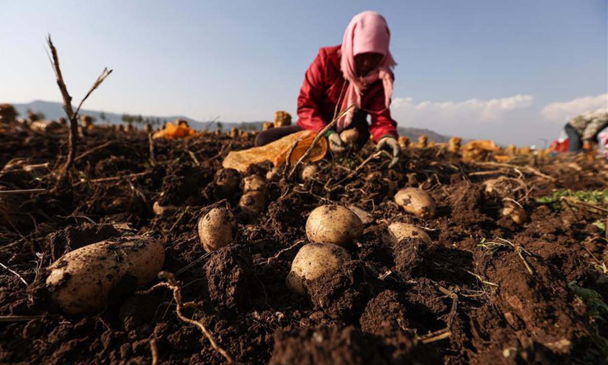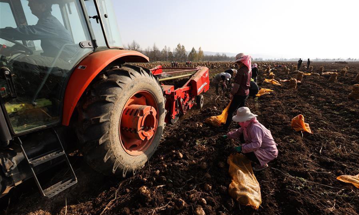 A villager harvests potatoes in Zhuozhatan Village of Huzhu Tu Autonomous County, northwest China's Qinghai Province, Oct. 10, 2020. In recent years, the county has been developing the potato industry to help its farmers improve income. (Xinhua/Wu Gang)