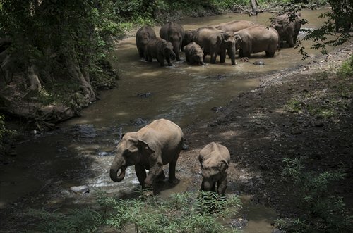 A herd of wild elephants are spotted at a riverside in the Wild Elephant Valley in Xishuangbanna Dai Autonomous Prefecture, Southwest China's Yunnan Province, on June 21, 2014. File Photo: IC