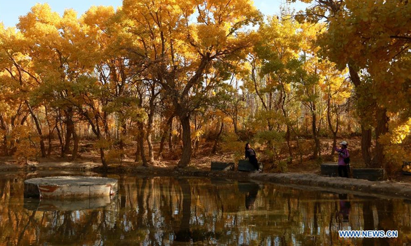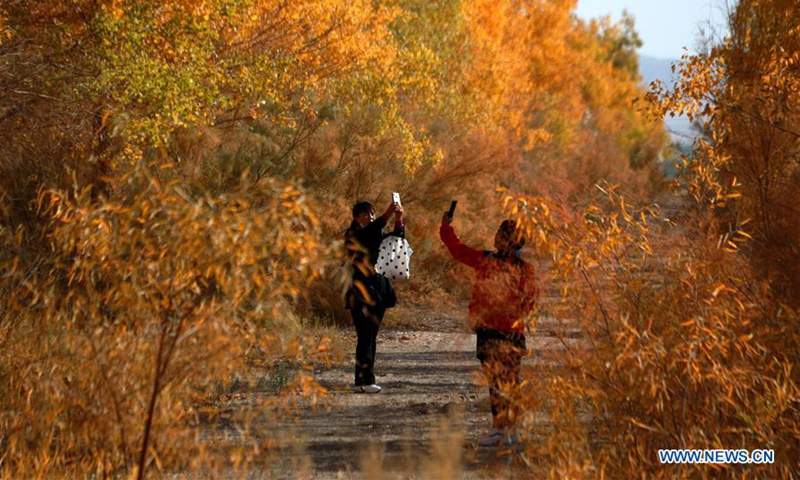 Tourists go sightseeing amid the populus euphratica forest in Mogao Town of Dunhuang City, northwest China's Gansu Province, Oct. 10, 2020. (Photo by Zhang Xiaoliang/Xinhua)
