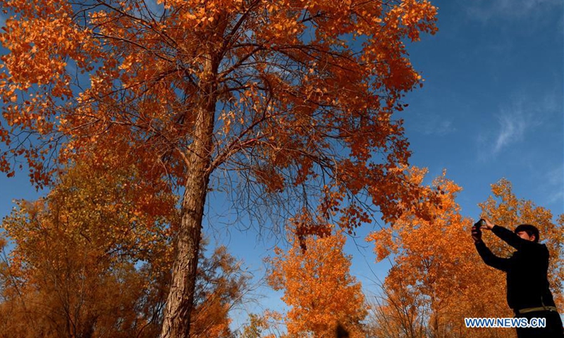A tourist takes pictures amid the populus euphratica forest in Mogao Town of Dunhuang City, northwest China's Gansu Province, Oct. 10, 2020. (Photo by Zhang Xiaoliang/Xinhua)