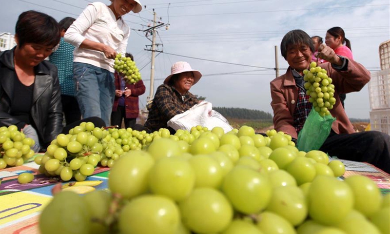 Villagers sorts grapes in Difang Town of Pingyi County in Linyi City of east China's Shandong Province, Oct. 11, 2020. (Photo by Wu Jiquan/Xinhua)