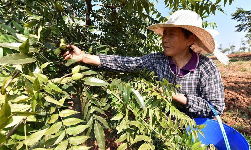 A villager picks walnuts in Longquan Village of Xiage Town in Chaohu City of east China's Anhui Province, Oct. 11, 2020. (Photo by Ma Fengcheng/Xinhua)