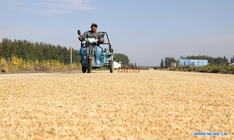 A farmer airs harvested rice in Sanhe Town of Hongze District, in Huaian City of east China's Jiangsu Province, Oct. 11, 2020. (Photo by Wan Zhen/Xinhua)