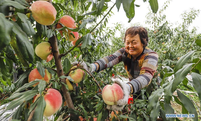 A villager picks peaches at an orchard in Xingwangzhai Township of Zunhua, Tangshan City, north China's Hebei Province, Oct. 11, 2020. (Photo by Liu Mancang/Xinhua)