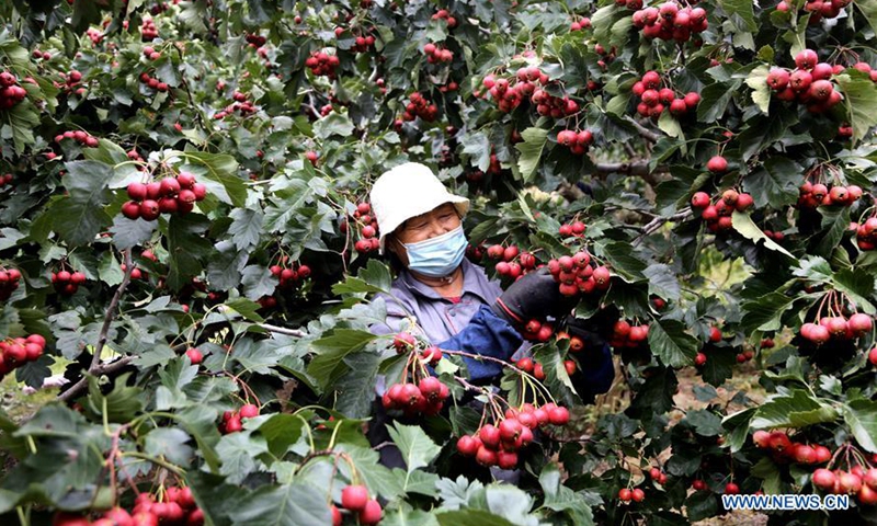 A villager picks hawthorn fruits in Hanli Village of Lianyungang City, east China's Jiangsu Province, Oct. 11, 2020. (Photo by Wang Chun/Xinhua)