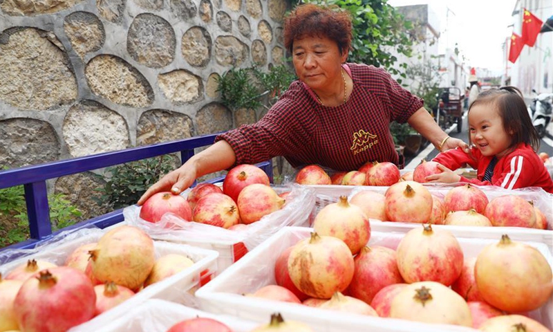 A villager loads pomegranates onto a truck in Liuyuan Village, Lieshan District of Huaibei City, east China's Anhui Province, Oct. 11, 2020. (Photo by Wan Shanchao/Xinhua)
