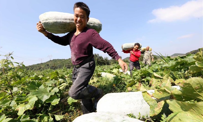 Villagers harvest wax gourds in a field in Houxi Village of Dongxiang District, Fuzhou City, east China's Jiangxi Province, Oct. 10, 2020. (Photo by He Jianghua/Xinhua)