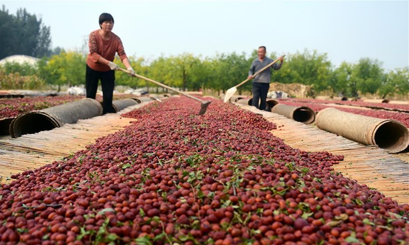 Farmers air red dates in Gaochuan Township of Cangxian County in Cangzhou City, north China's Hebei Province, Oct. 11, 2020. (Photo by Fu Xinchun/Xinhua)