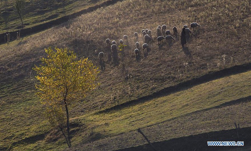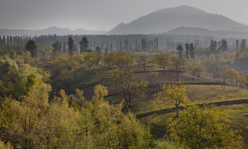 Photo taken on Oct. 11, 2020 shows the autumn scenery at a village in Budgam district, about 45 km southwest of Srinagar city, the summer capital of Indian-controlled Kashmir. (Xinhua/Javed Dar)