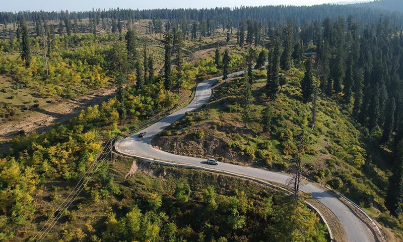 Aerial photo taken on Oct. 11, 2020 shows the autumn scenery at a village in Budgam district, about 45 km southwest of Srinagar city, the summer capital of Indian-controlled Kashmir. (Xinhua/Javed Dar)