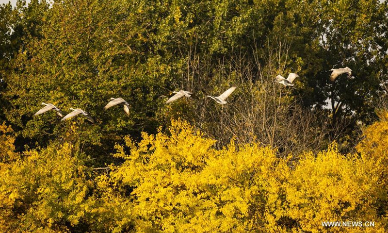 Birds fly over Lobdell Lake in Genesee County, Michigan, the United States, on Oct. 10, 2020. (Photo by Joel Lerner/Xinhua)