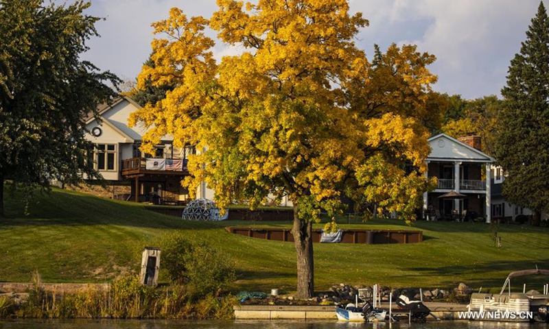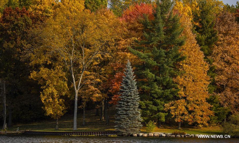 Photo taken on Oct. 10, 2020 shows fall foliage at Lobdell Lake in Genesee County, Michigan, the United States. (Photo by Joel Lerner/Xinhua)
