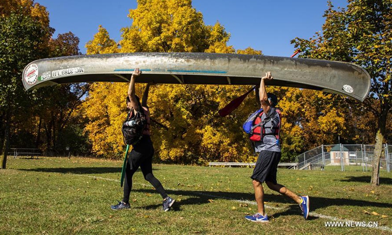People portage their canoes between Kent Lake and the Hudson River at the Island Lake Recreation Center in Livingston County of Michigan, the United States, on Oct. 11, 2020. (Photo by Joel Lerner/Xinhua)