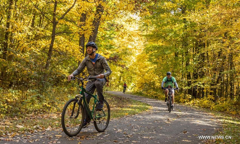 Hikers and cyclists enjoy fall foliage at the Island Lake Recreation Center in Livingston County of Michigan, the United States, on Oct. 11, 2020. (Photo by Joel Lerner/Xinhua)