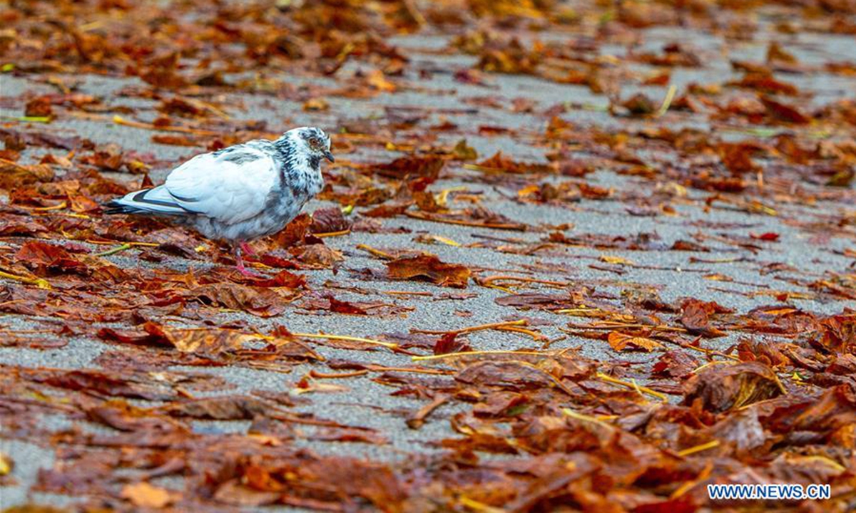 A pigeon stands among the fallen leaves in Volksgarten in Vienna, Austria, Oct. 12, 2020. (Xinhua/Guo Chen)