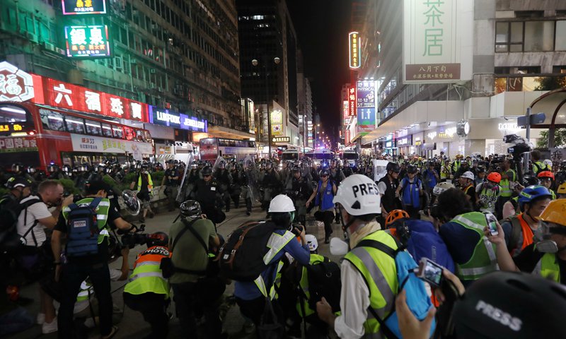 Reporters in Hong Kong stand in front of police officers as rioters attacked a local police station in Mongkok in August, 2019. Photo: Cui Meng/GT