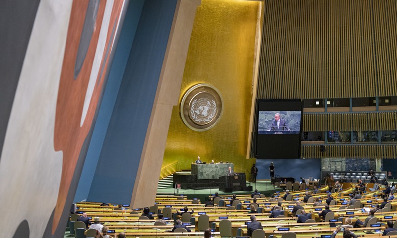 Photo taken on Sept. 22, 2020 shows the general debate of the 75th session of the UN General Assembly at the UN headquarters in New York. (Rick Bajornas/UN Photo/Handout via Xinhua)