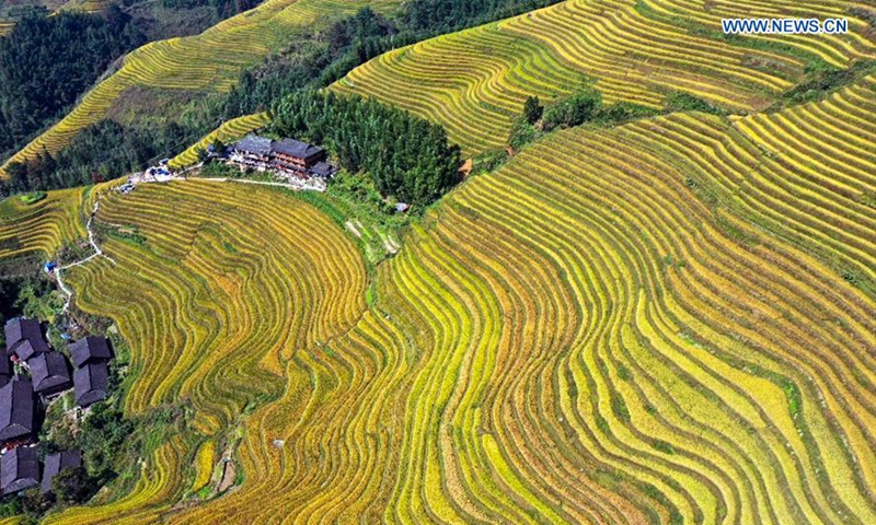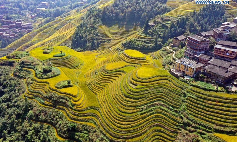 Aerial photo taken on Oct. 12, 2020 shows a view of the Longji terraced fields in Longsheng County, south China's Guangxi Zhuang Autonomous Region. (Photo by Wu Shengbin/Xinhua)
