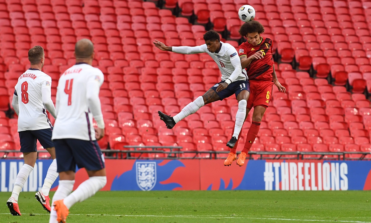 England striker Marcus Rashford (No.11) competes for a header with Belgium midfielder Axel Witsel at Wembley stadium in London on Sunday. Photo: VCG