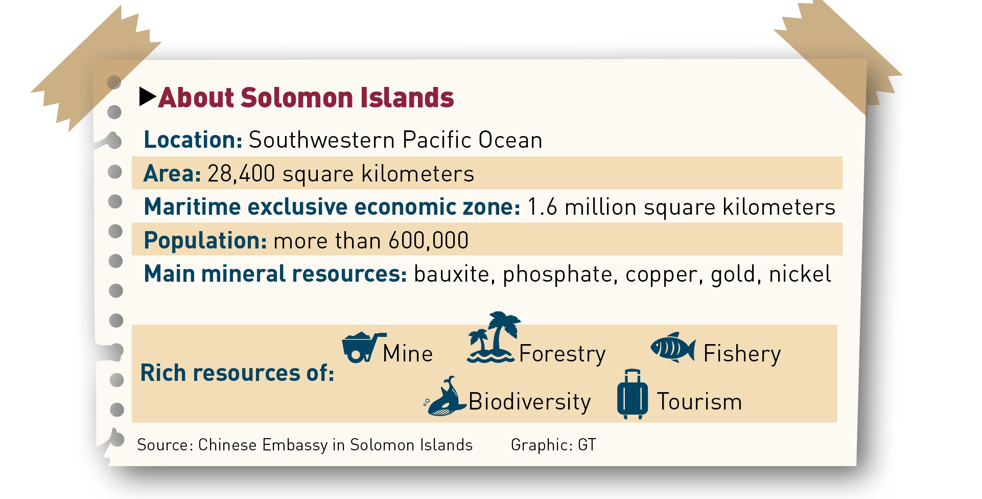 3. GT: What is the situation of overseas Chinese and Chinese companies in the Solomon Islands?Li: There are a few thousand Chinese citizens and overseas Chinese in Solomon Islands. At the beginning of the last century, Chinese arrived in Solomon Islands traversing vast Pacific Ocean and made important contributions to the economic construction and social development of this country. They have now closely integrated into the local society of Solomon Islands.