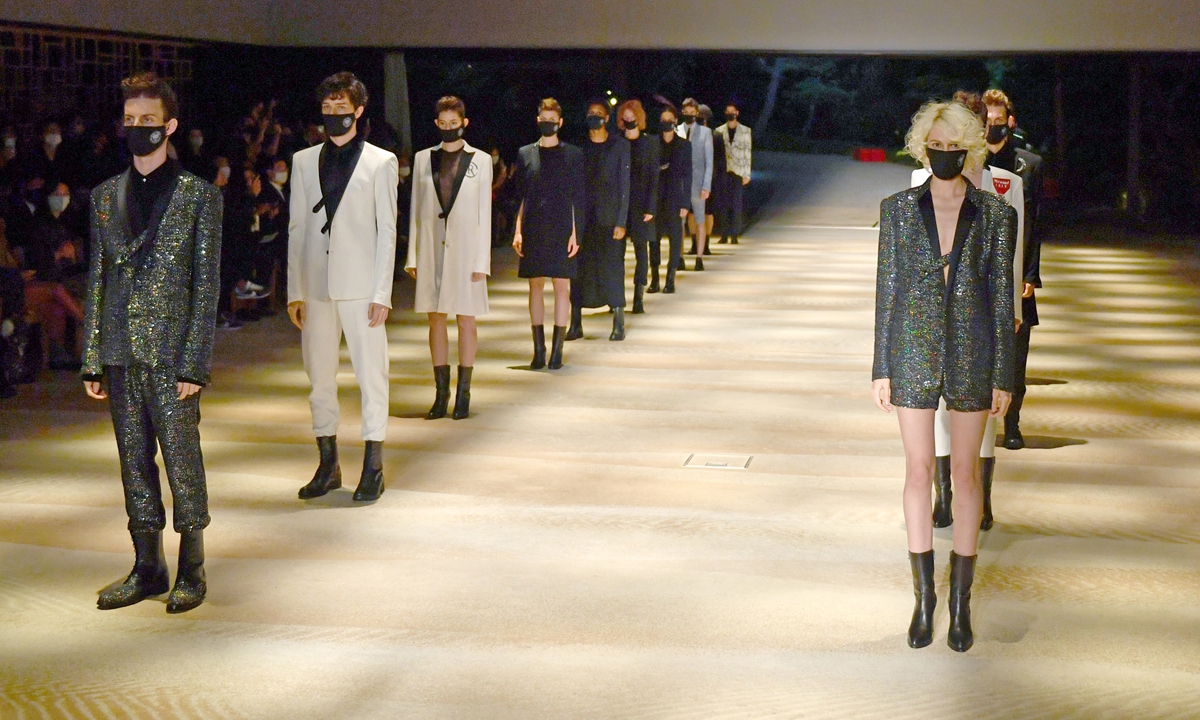 Models wearing face masks present creations by RINSHU during the 2021 Spring/Summer ready-wear show at Rakuten Fashion Week in Tokyo on Monday. Photo: AFP