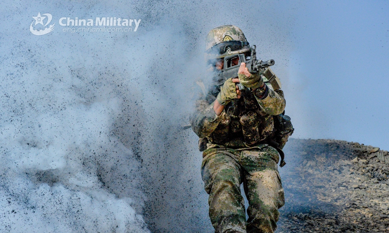 A soldier assigned to a combined arms brigade under the PLA 76th Group Army uses smoke bombs to create a smokescreen for concealment as he engages mock enemy with his rifle during a real-combat drill on September 26, 2020, which aims to beef up soldiers' courage and uprightness in battlefield. (eng.chinamil.com.cn/Photo by Zhang Yongqiang)