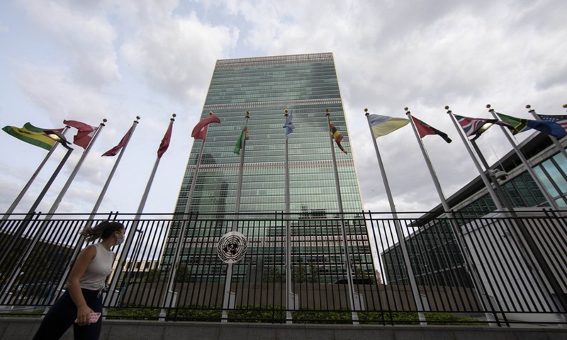 A woman walks past the United Nations headquarters in New York, the United States, Sept. 14, 2020. (Photo: Xinhua)