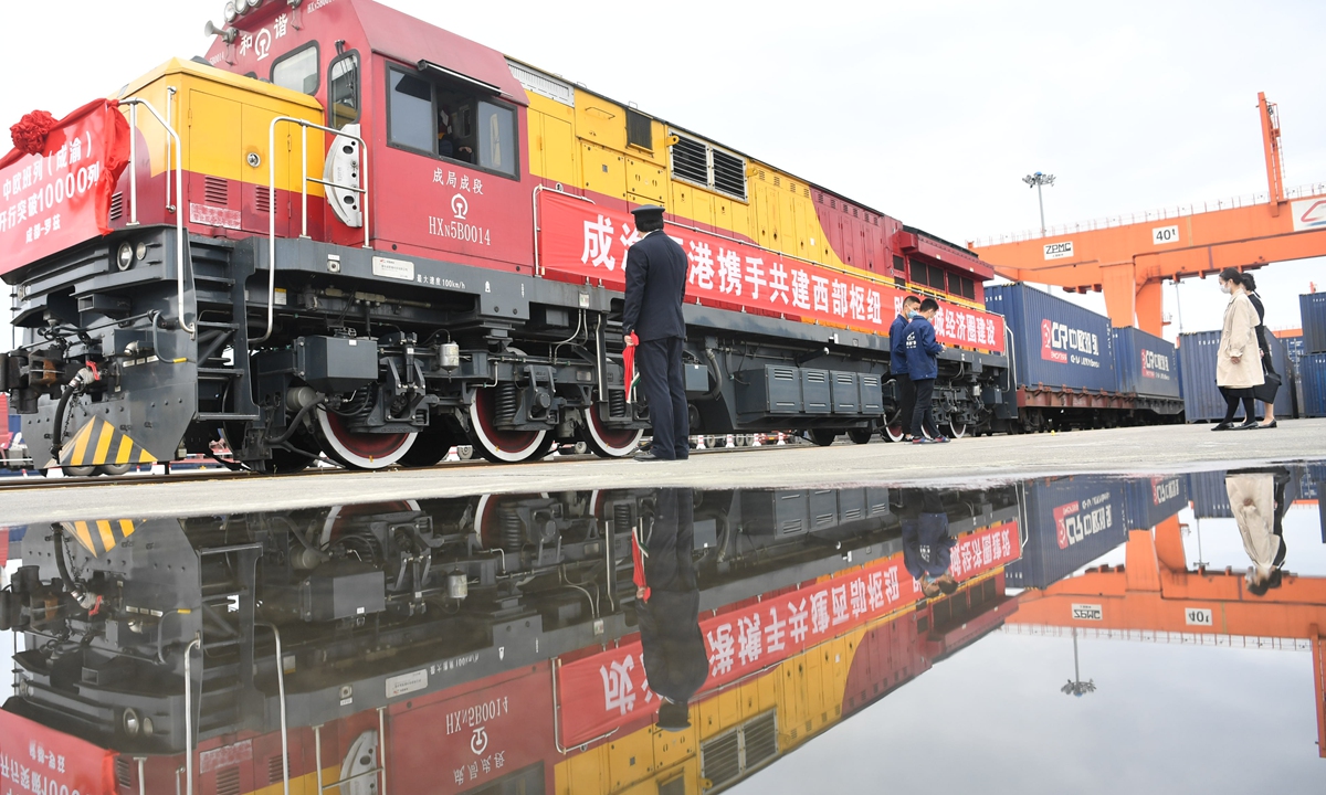 A cargo train bound for Europe leaves Chengdu, Southwest China's Sichuan Province. The China-Europe freight trains on the Chengdu route have maintained an average daily frequency of eight so far this month, and the cumulative number of trains has exceeded that of last year, rising 58.6 percent year-on-year. Photo: cnsphoto