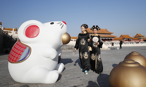 Two female tourists donning ancient costumes pose for a photo with the 2020 mascot, signifying the Year of Rat, in the Palace Museum in Beijing on Friday. Photo: cnsphoto