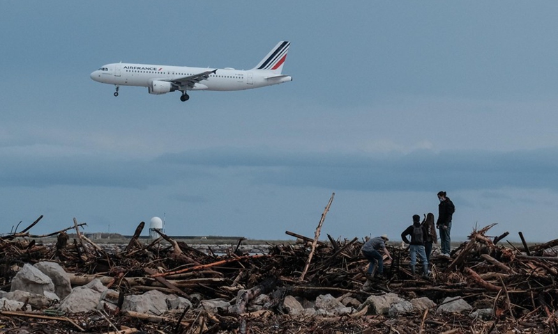 Photo taken on Oct. 4, 2020 shows a beach after a storm in Saint-Laurent-du-Var, near France's southern coastal city of Nice. Flash floods that struck France's southeast region of Alpes-Maritimes over the weekend have so far left two people dead and 20 others missing, local authorities said on Monday. (Photo by Serge Haouzi/Xinhua)