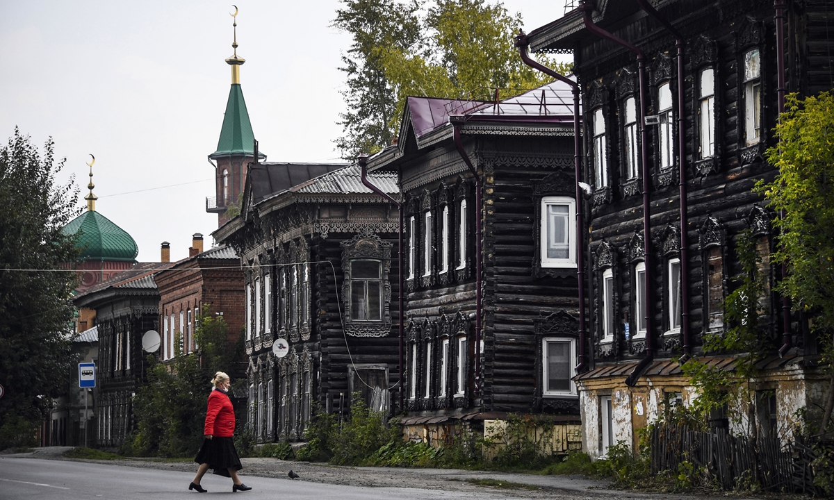 A woman crosses a street in Tatar neighborhood, a traditional wooden housing district in the Siberian city of Tomsk, on September 8. Photo: AFP