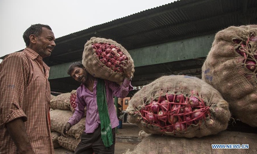 A labor carries a sack of onions at a wholesale market in New Delhi, India, on Dec. 5, 2019. The onion prices across Indian states continue to soar as government promised to import the edible bulbs from foreign countries. Photo:Xinhua