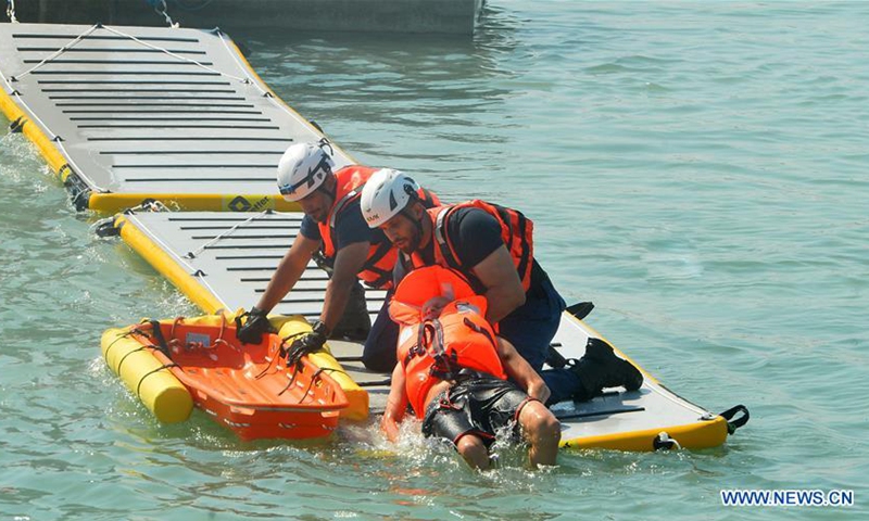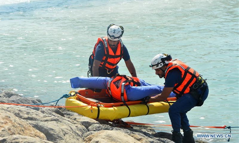 Firefighters participate in a rescue drill in Capital Governorate, Kuwait, Oct. 14, 2020. Kuwait launched on Wednesday a rescue drill to enhance the capabilities of the country to prepare for the upcoming rainy season. (Photo by Asad/Xinhua)