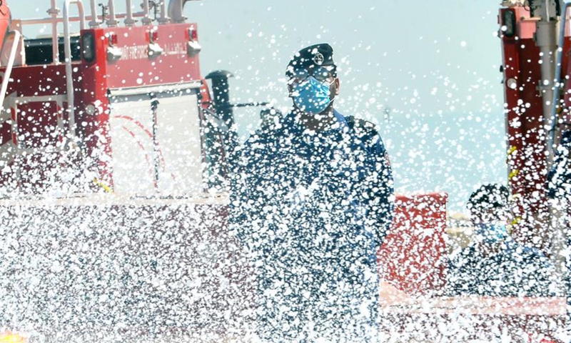 A firefighter checks the water pump during a rescue drill in Capital Governorate, Kuwait, Oct. 14, 2020. Kuwait launched on Wednesday a rescue drill to enhance the capabilities of the country to prepare for the upcoming rainy season. (Photo by Asad/Xinhua)