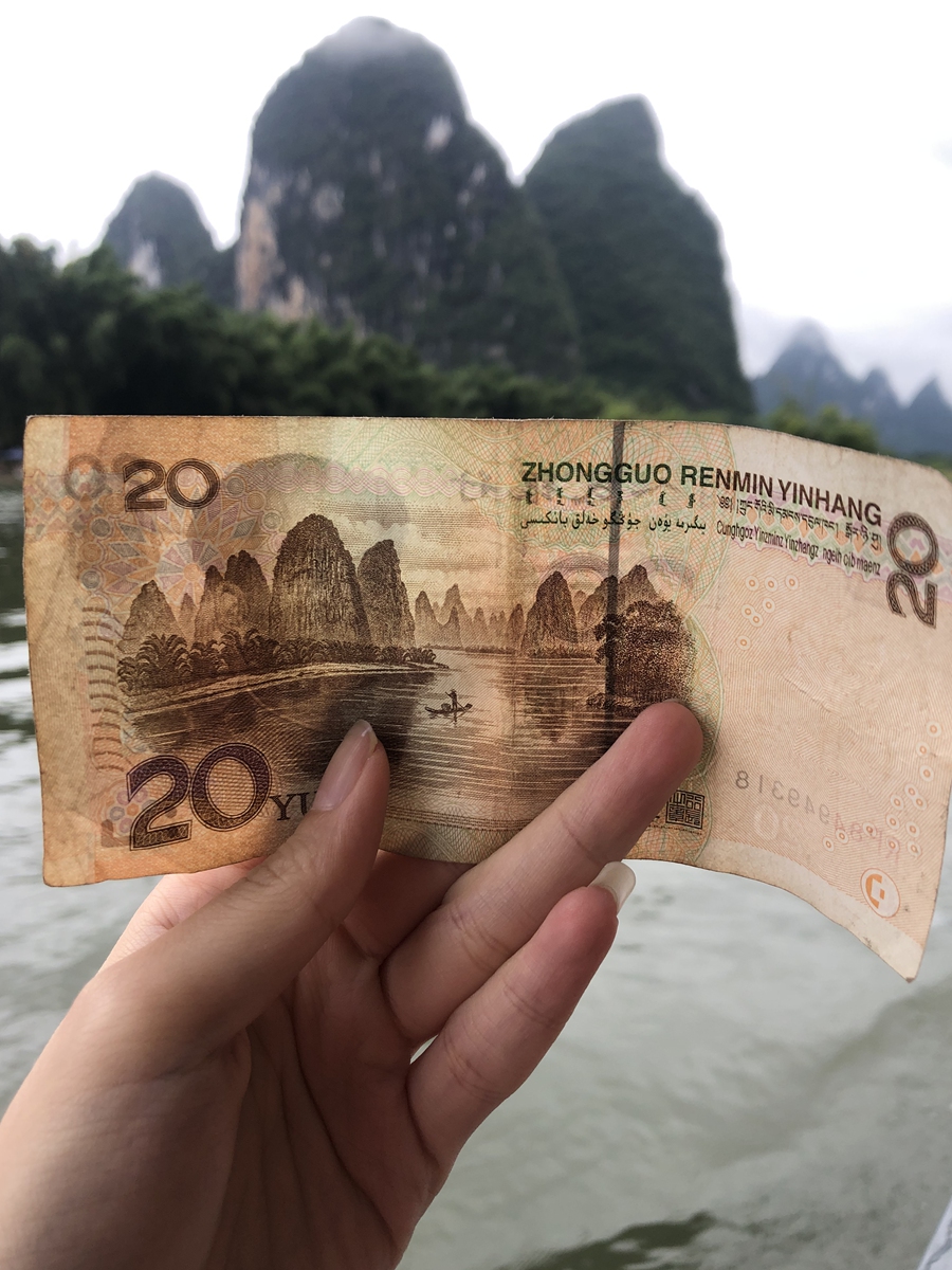 When getting out of the taxi, the driver told me to prepare a 20 yuan note, as one spot on the river is printed on the bill. I actually saw some visitors holding up the note to compare it with the scene and take photos.