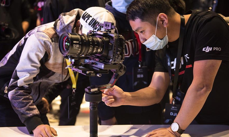 People try DJI RS 2 after the launch event in Beijing, capital of China, Oct. 15, 2020. Chinese drone maker DJI launched RS 2 and RSC 2, two new gimbals of Ronin series in Beijing on Thursday. DJI RS 2 brings added strength and agility to creators using heavier camera systems such as DSLR and compact cinema cameras. At the same time, DJI RSC 2 was created to be more portable, meeting the needs of mirrorless and more compact camera operators. (Xinhua/Zhang Haofu)
