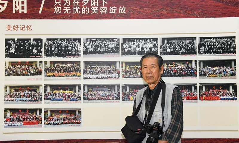 Xie Jinsheng poses with the 20 group photos he has shot for the elderly living at an elderly service center in Wuxing District of Huzhou, east China's Zhejiang Province, Oct. 14, 2020. Xie Jinsheng, 86, a photography enthusiast in Huzhou, has kept on taking group photos for the elderly living at the elderly service center each year since 2,000. (Xinhua/Weng Xinyang)