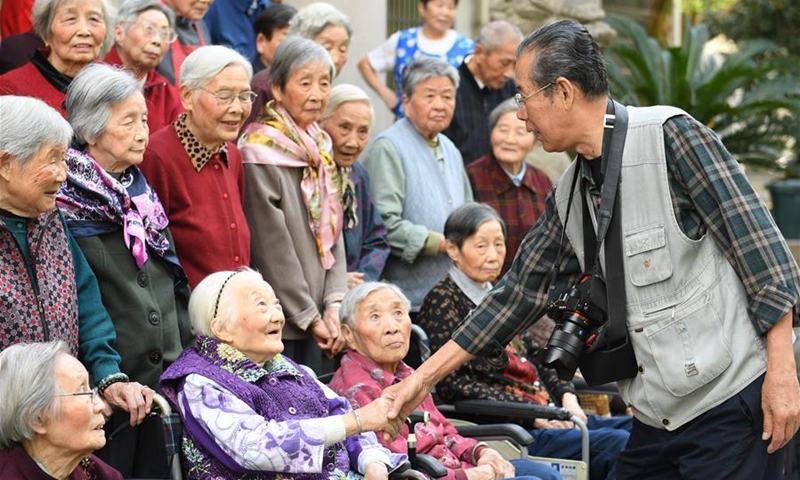 Xie Jinsheng (R) greets the elderly living at an elderly service center before taking a group photo for them in Wuxing District of Huzhou, east China's Zhejiang Province, Oct. 14, 2020. Xie Jinsheng, 86, a photography enthusiast in Huzhou, has kept on taking group photos for the elderly living at the elderly service center each year since 2,000. (Xinhua/Weng Xinyang)