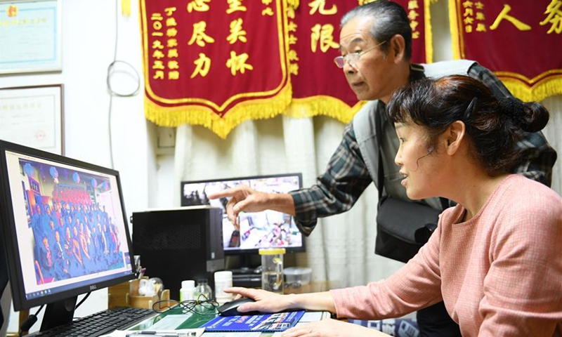 Xie Jinsheng (rear) and Shao Xiaoying, person in charge of an elderly service center, check the group photos shot in previous years at the elderly service center in Wuxing District of Huzhou, east China's Zhejiang Province, Oct. 14, 2020. Xie Jinsheng, 86, a photography enthusiast in Huzhou, has kept on taking group photos for the elderly living at the elderly service center each year since 2,000. (Xinhua/Weng Xinyang)