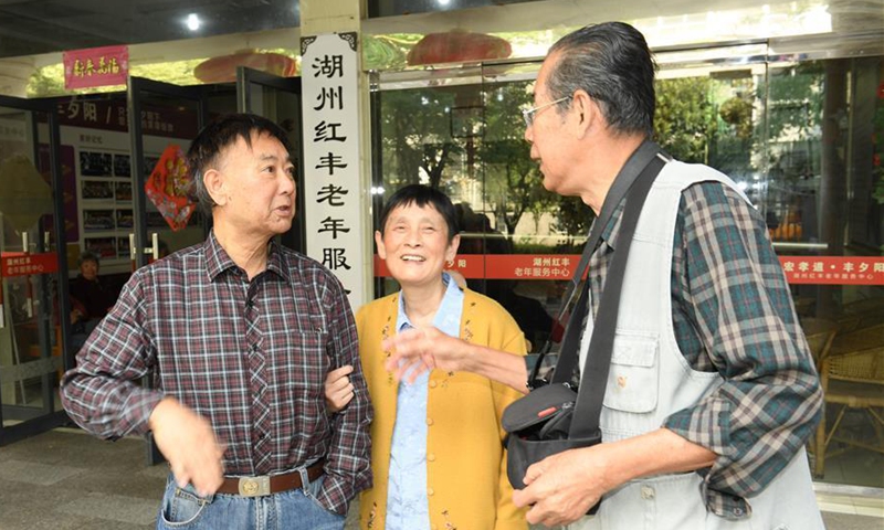 Xie Jinsheng (R) talks with photography enthusiasts living at an elderly service center in Wuxing District of Huzhou, east China's Zhejiang Province, Oct. 14, 2020. Xie Jinsheng, 86, a photography enthusiast in Huzhou, has kept on taking group photos for the elderly living at the elderly service center each year since 2,000. (Xinhua/Weng Xinyang)