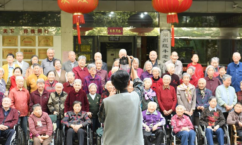 Xie Jinsheng (front) takes a group photo for the elderly living at an elderly service center in Wuxing District of Huzhou, east China's Zhejiang Province, Oct. 14, 2020. Xie Jinsheng, 86, a photography enthusiast in Huzhou, has kept on taking group photos for the elderly living at the elderly service center each year since 2,000. (Xinhua/Weng Xinyang)