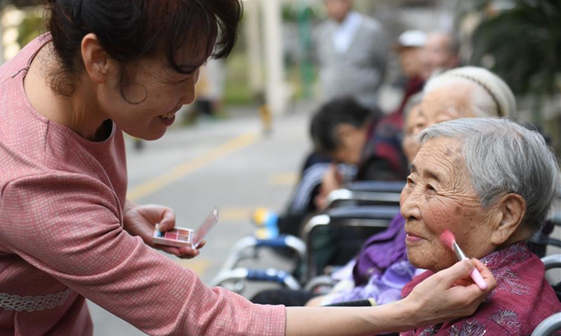 Shao Xiaoying (L), person in charge of an elderly service center, puts on make-up for the elderly before they pose for a group photo at the elderly service center in Wuxing District of Huzhou, east China's Zhejiang Province, Oct. 14, 2020. Xie Jinsheng, 86, a photography enthusiast in Huzhou, has kept on taking group photos for the elderly living at the elderly service center each year since 2,000. (Xinhua/Weng Xinyang)