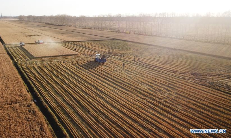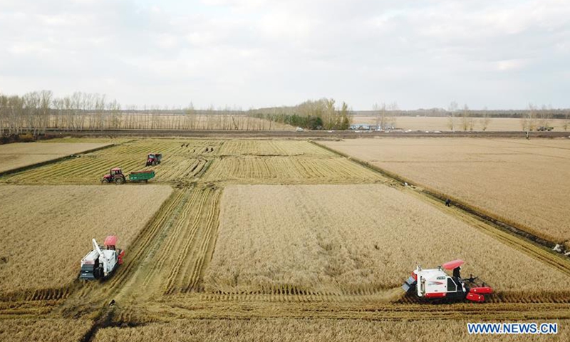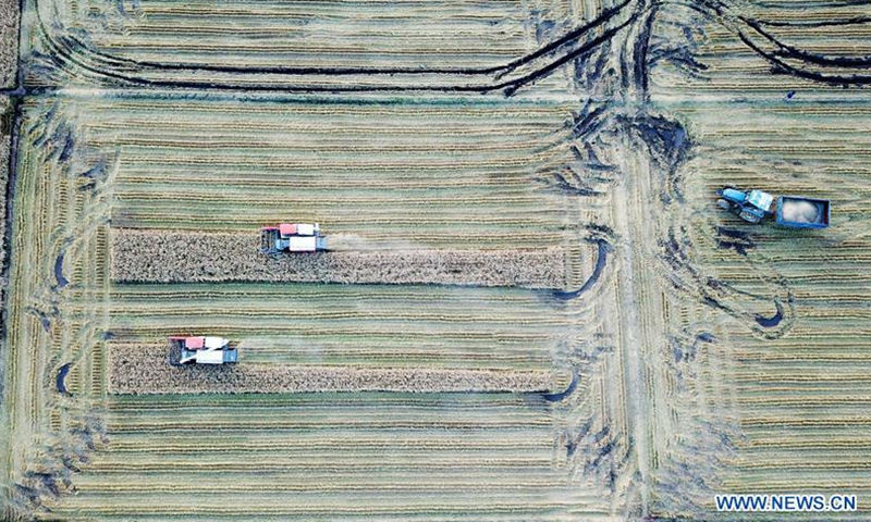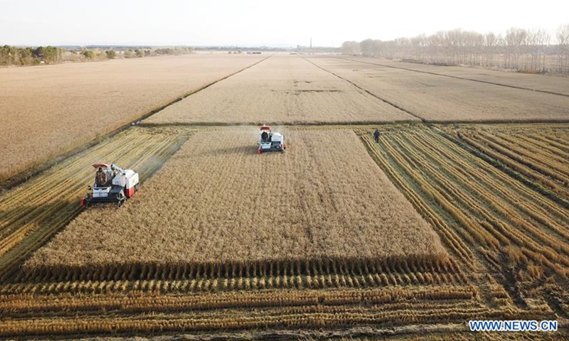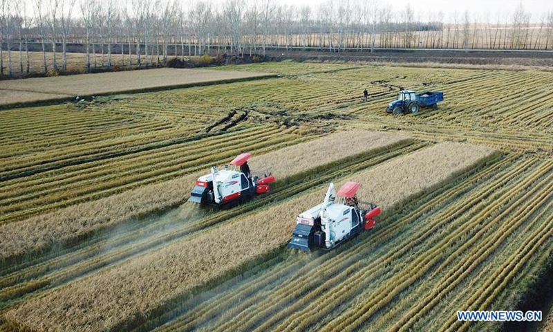 Aerial photo taken on Oct. 15, 2020 shows people driving harvesters in paddy fields in Hongwei farm, northeast China's Heilongjiang Province.Photo:Xinhua