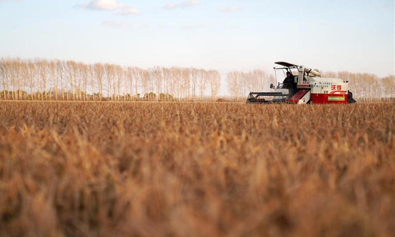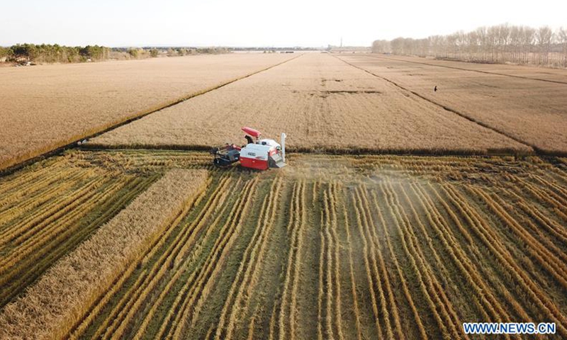 A man driving harvester works in paddy fields in Hongwei farm, northeast China's Heilongjiang Province, Oct. 15, 2020. Photo:Xinhua