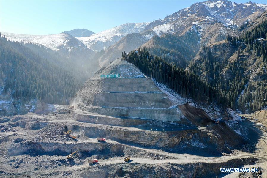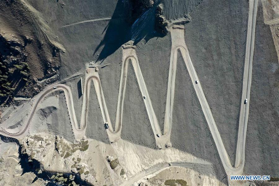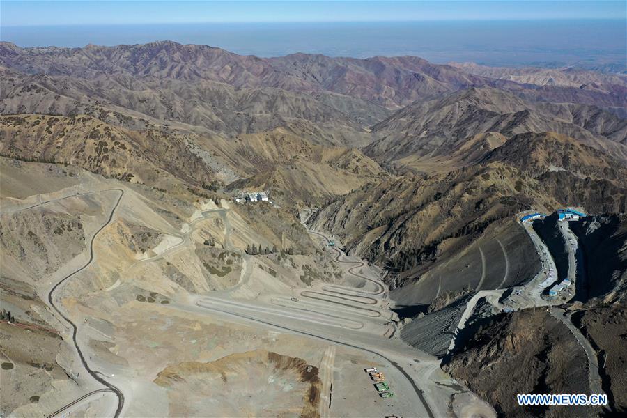 Aerial photo shows the construction site of Fukang pumped-storage power station in Fukang City, northwest China's Xinjiang Uygur Autonomous Region, Oct. 15, 2020. With a total installed capacity of 1.2 million kilowatts, the station is the first pumped-storage power station under construction in Xinjiang. (Xinhua/Ding Lei)